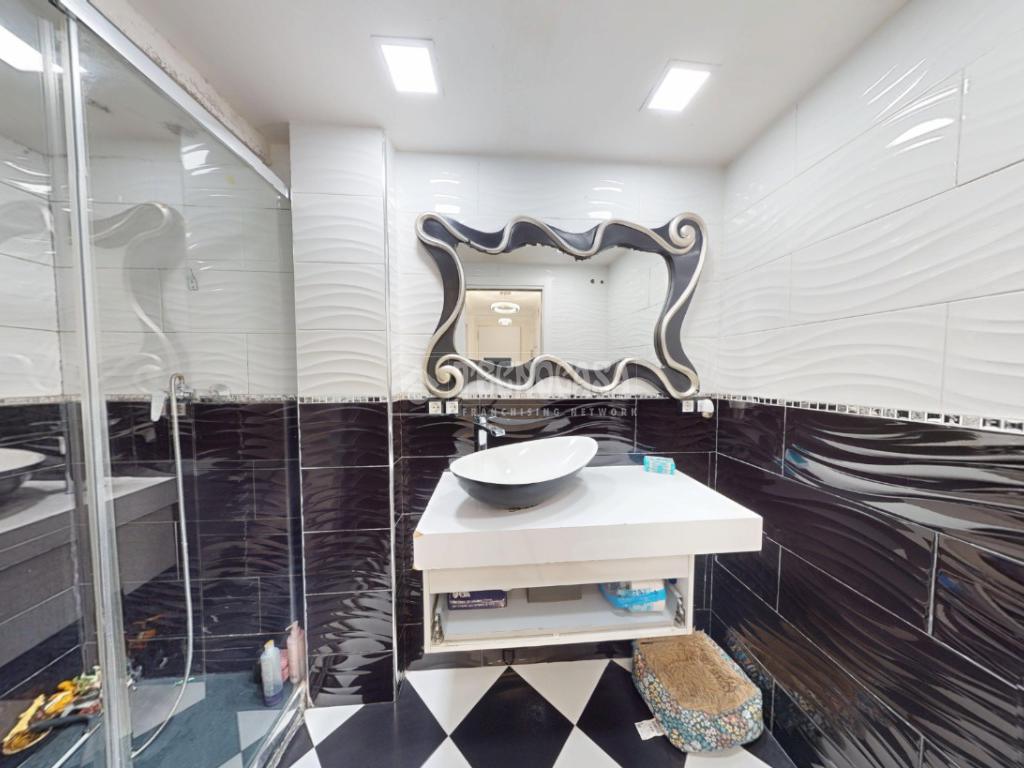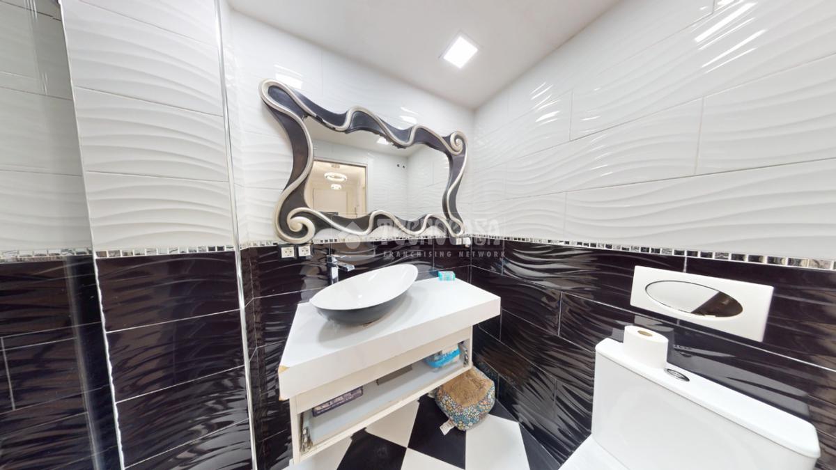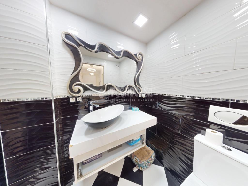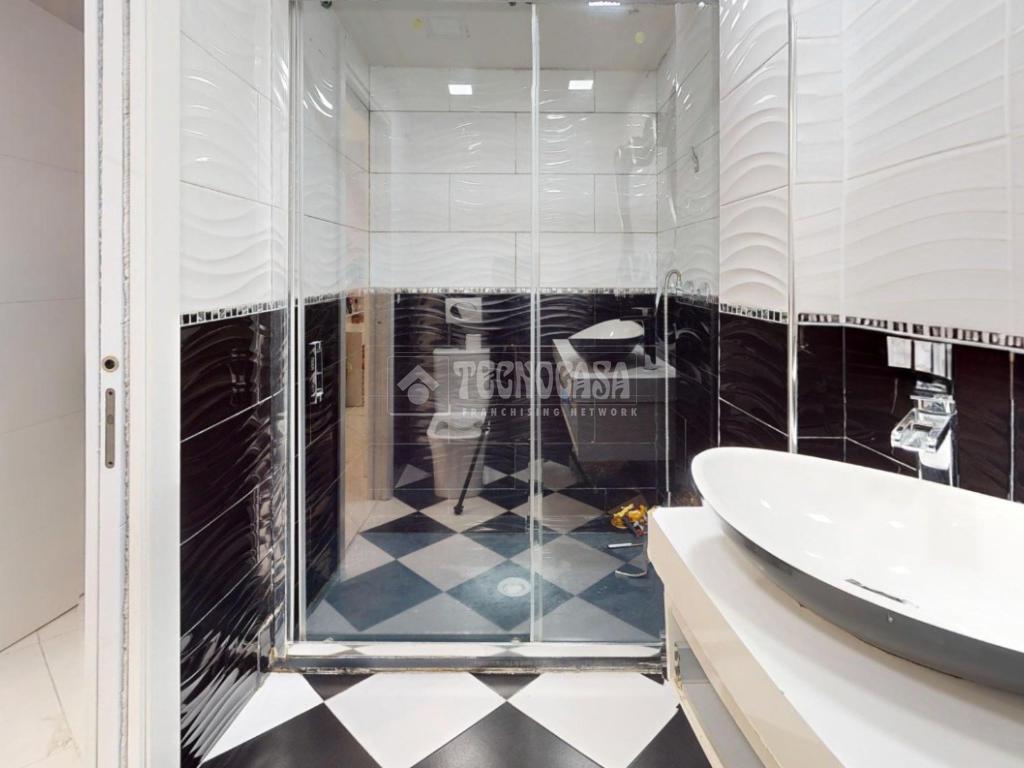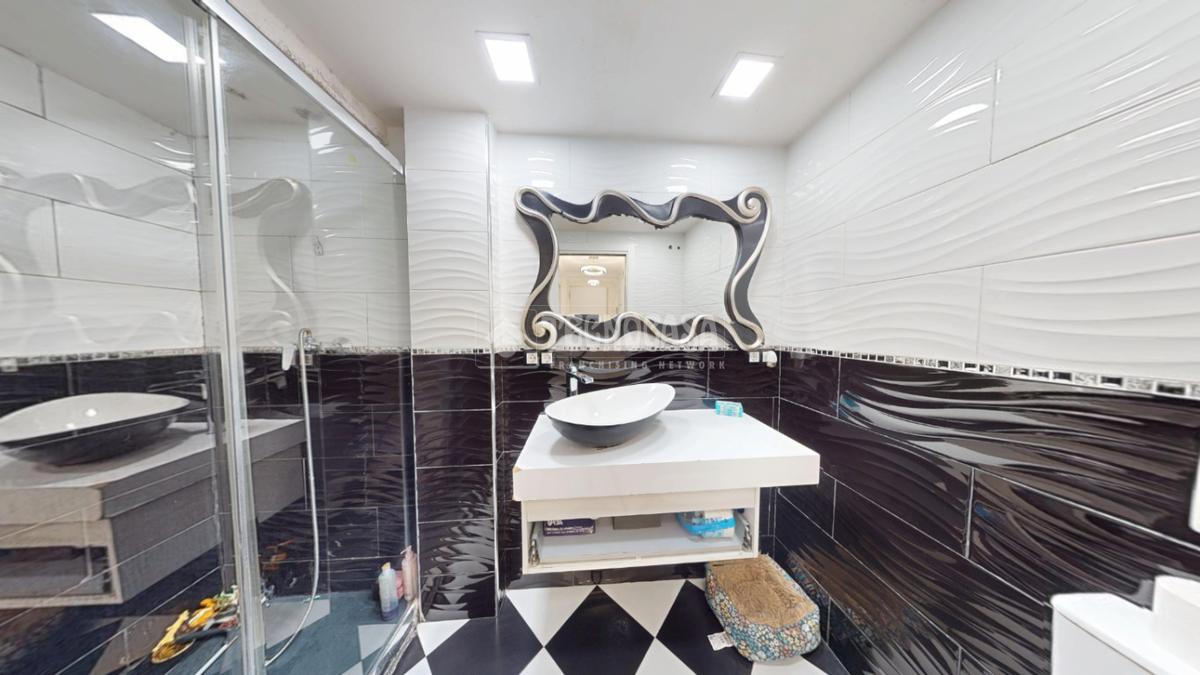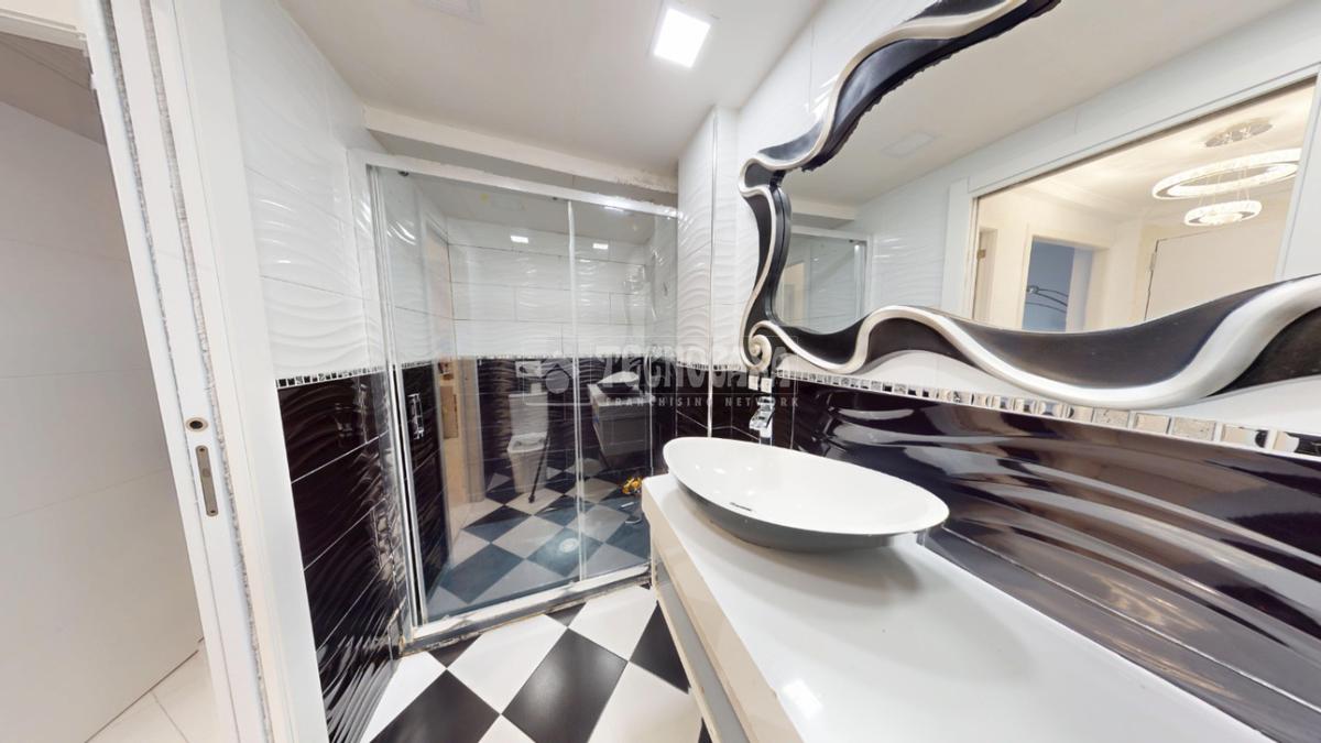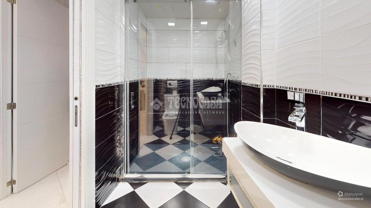 El baño cuenta con un moderno plato de ducha y un diseño cuidado al detalle, combinando estilo y practicidad.